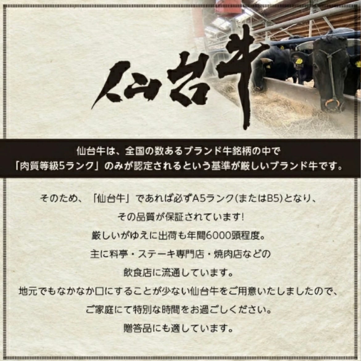 仙台食肉市場を経てA5等級と認められたものが仙台牛となるため、産地や農場を特定して扱うには商品開発が難しいものでもあります。当店で取り扱う仙台牛は、地域の繁殖農家、肥育農家、卸事業者、加工事業者と協力し、仙台食肉市場から厳選して「一頭買い」した仙台牛を取り扱っているため、いつでも「生産者の見える安心した和牛」を全国のご家庭へお届けいたします。