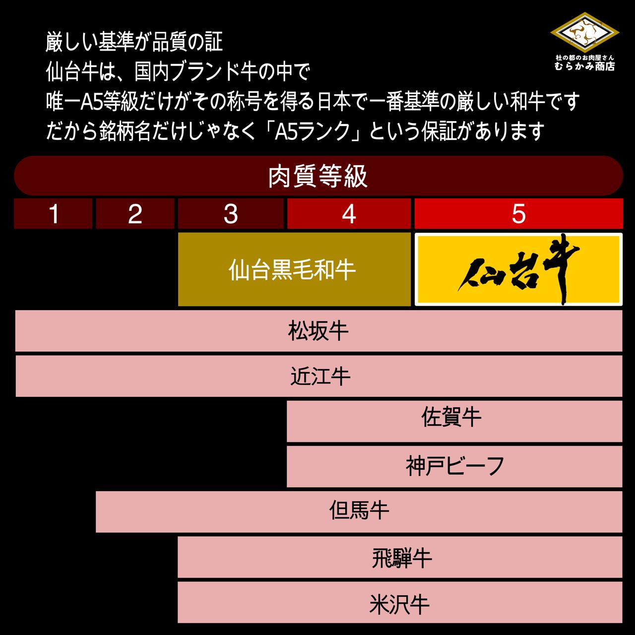 すなわち「ブランド牛の銘柄名」だけではなく「仙台牛=A5ランク」という保証があります。