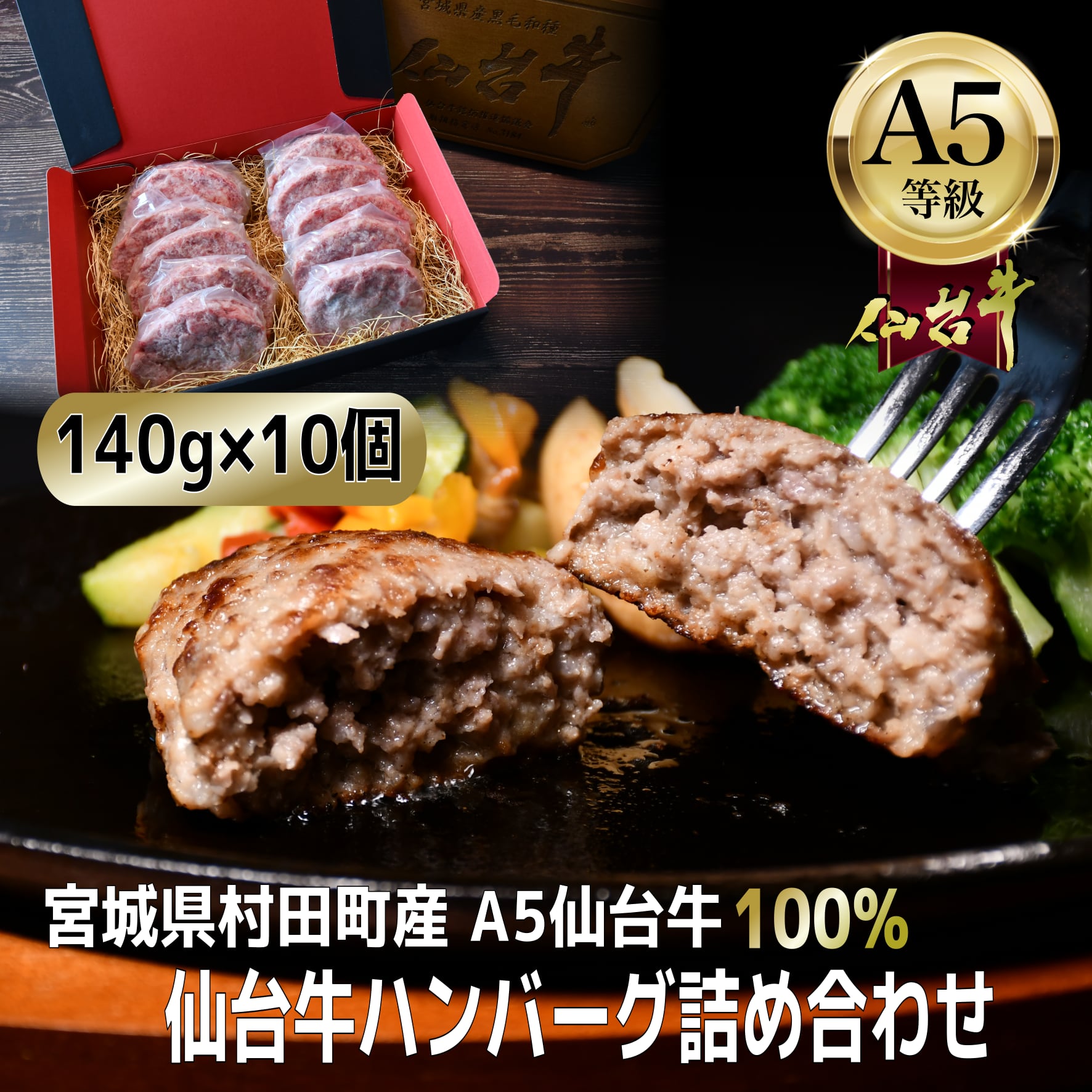 ・A5仙台牛100%プレミアムハンバーグ(140g×5個)
